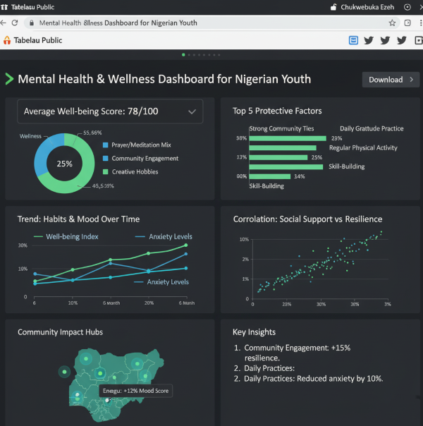 An interactive Tableau dashboard analyzing the correlation between wellness habits and mental health outcomes in Nigerian youth. This project showcases my skills in data cleaning, statistical analysis, and compelling data visualization.
